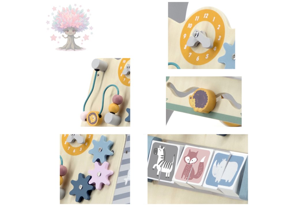 Na přední straně se nachází interaktivní hrací panel s otáčecími kolečky, posuvnými korálky, otočnými bloky se zvířátky a hodinami s pohyblivými ručičkami. Děti si tak procvičují prstíky, koordinaci i trpělivost.