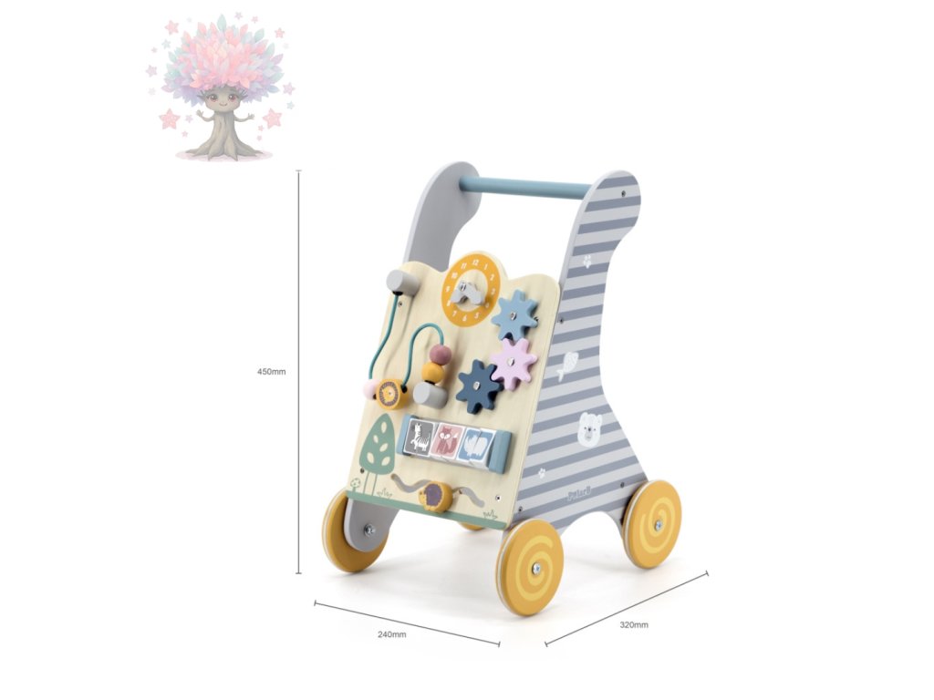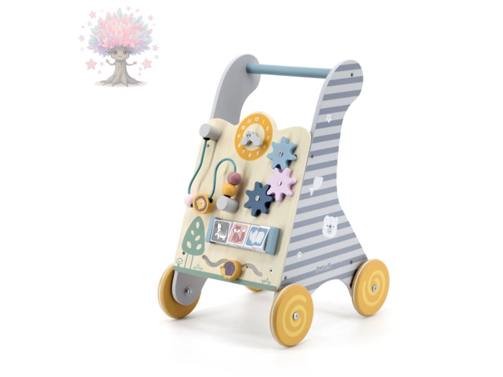 Dřevěné aktivní chodítko s herním panelem. Pomáhá dětem s prvními krůčky a rozvíjí motoriku, koordinaci i zvídavost.