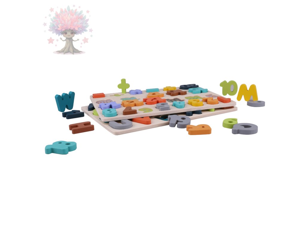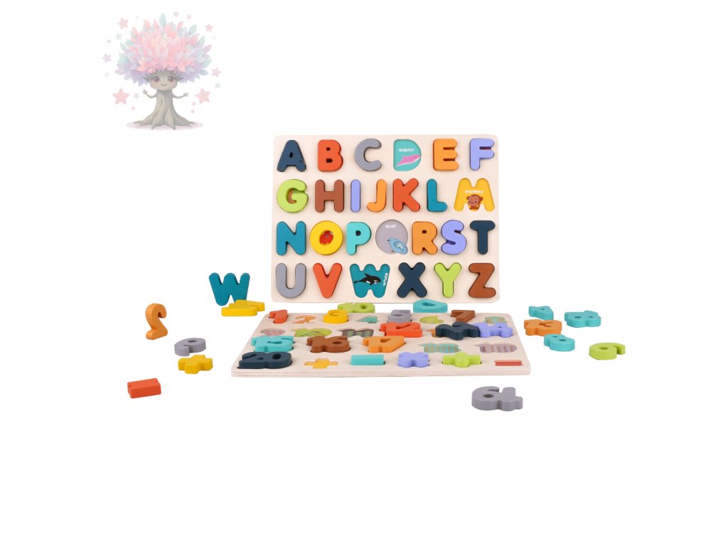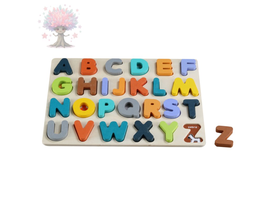 Dřevěná vkládačka s písmeny abecedy A–Z. Podporuje učení písmen, barev i jemné motoriky. Skvělá vzdělávací hračka pro děti.