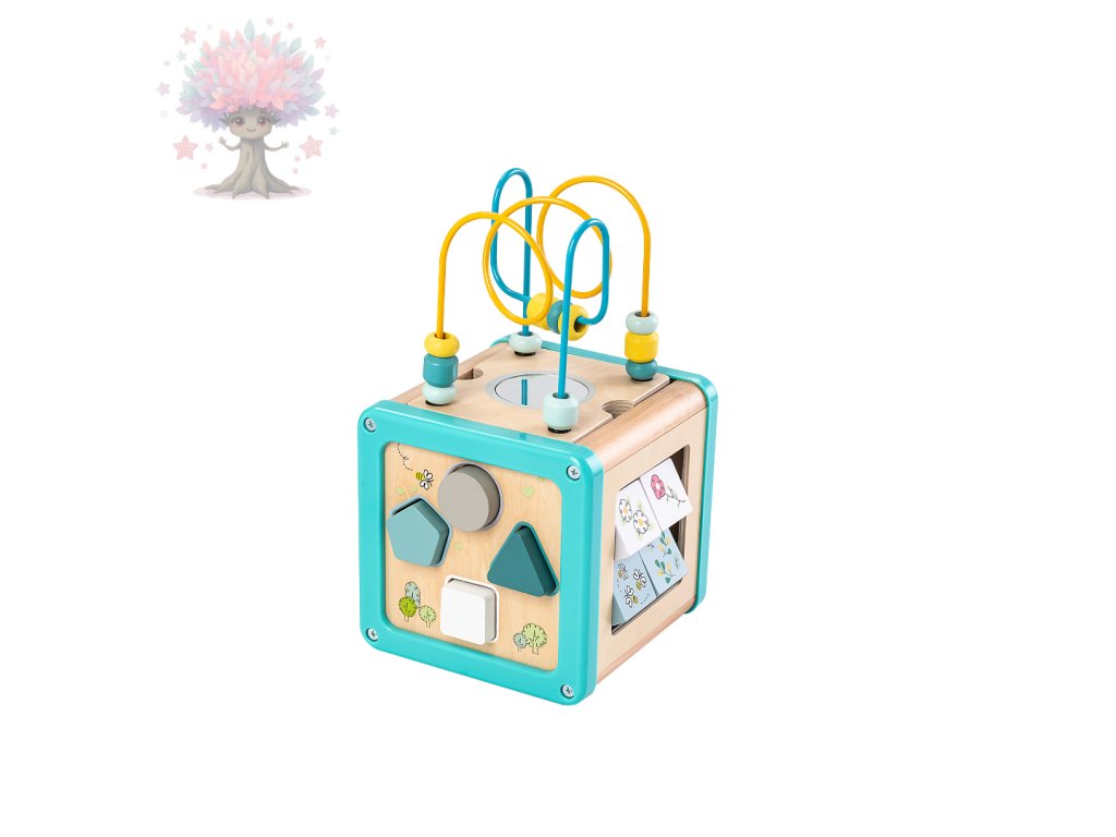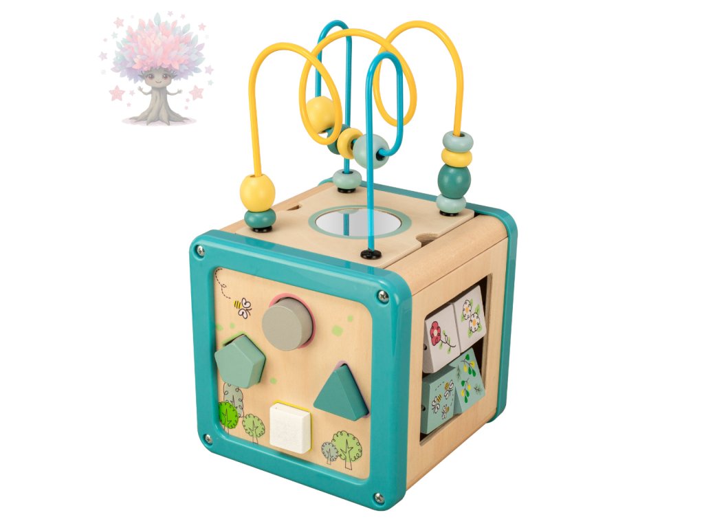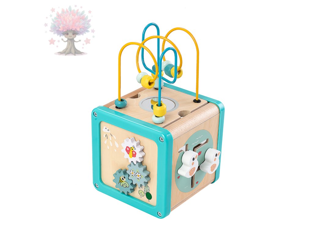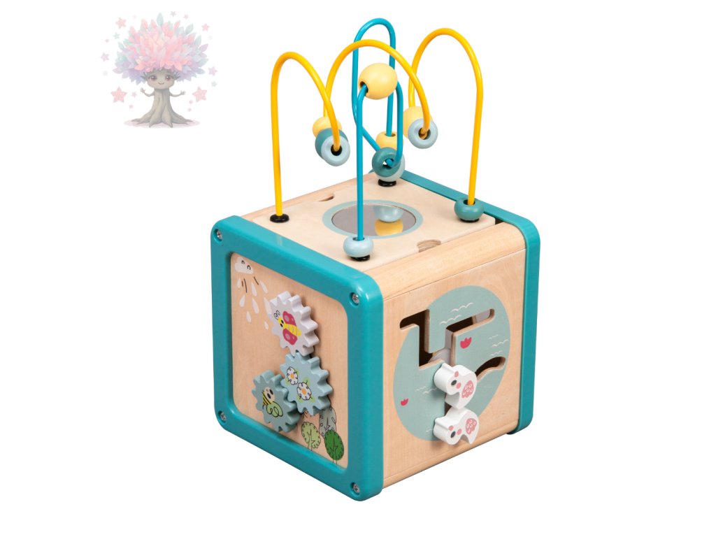 Dřevěná motorická kostka s korálkovým bludištěm, ozubenými kolečky a dalšími aktivitami. Podporuje rozvoj jemné motoriky, logiky a koordinace pohybů.