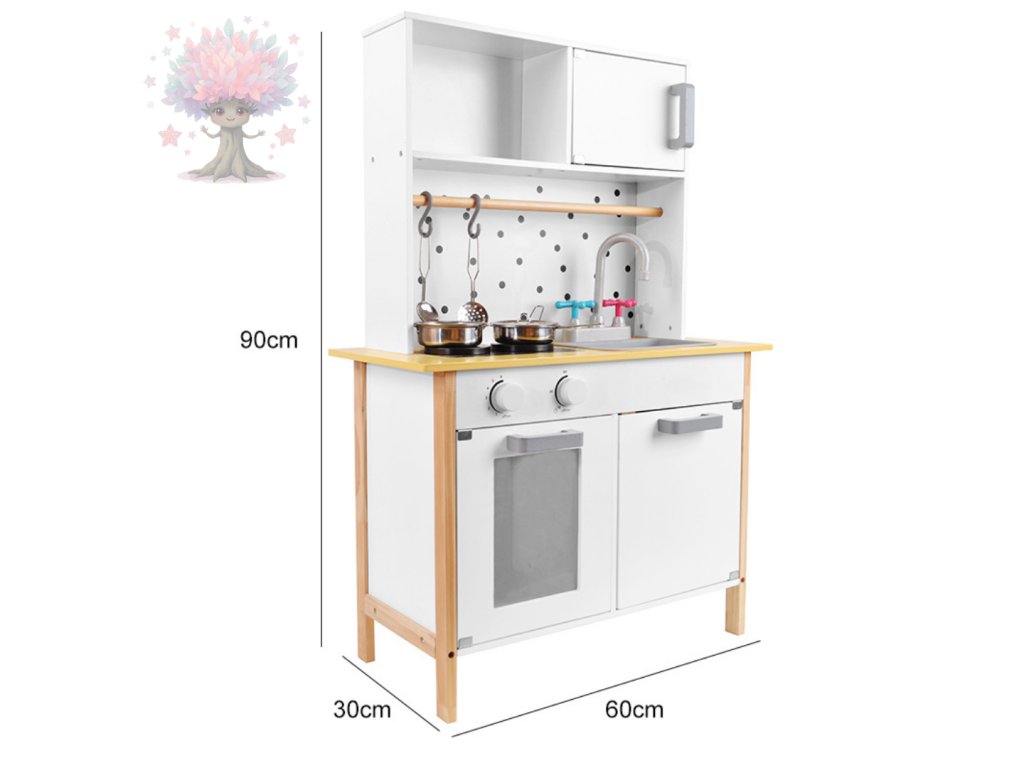Kuchyňka je vyrobena z kvalitního a odolného dřeva s hladkými hranami, takže je bezpečná pro děti. Díky praktickým rozměrům (90 × 60 × 30 cm) se vejde do každého pokojíčku a poskytne dostatek prostoru pro kreativní hru.