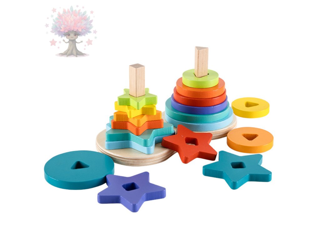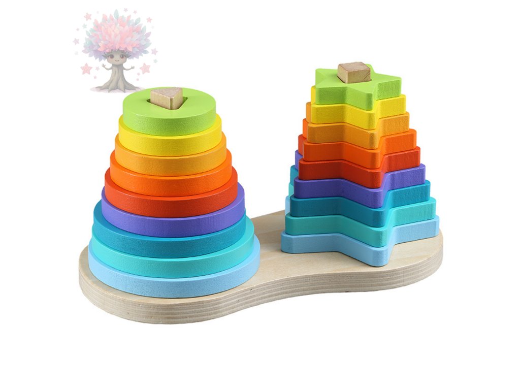 Hračka podporuje rozvoj jemné motoriky, logického myšlení, trpělivosti i poznávání barev a tvarů. Díky pestrému duhovému provedení děti motivuje ke hře a učení. Vyrobena je z kvalitního dřeva s hladkými hranami, takže je bezpečná i pro batolata.