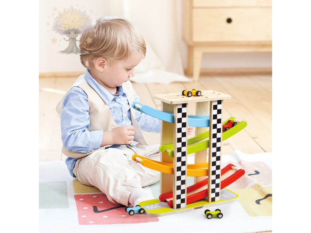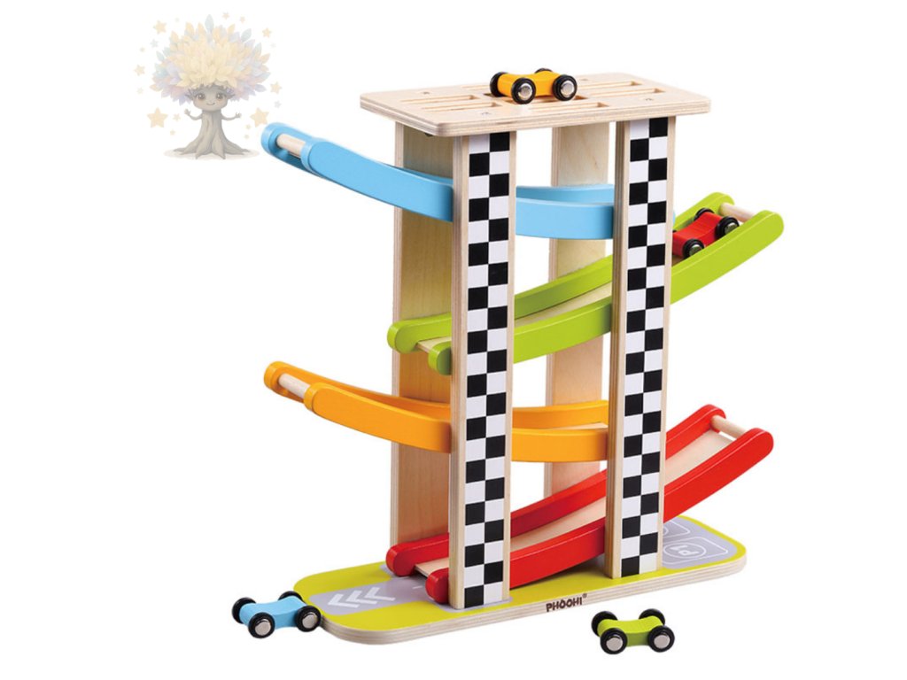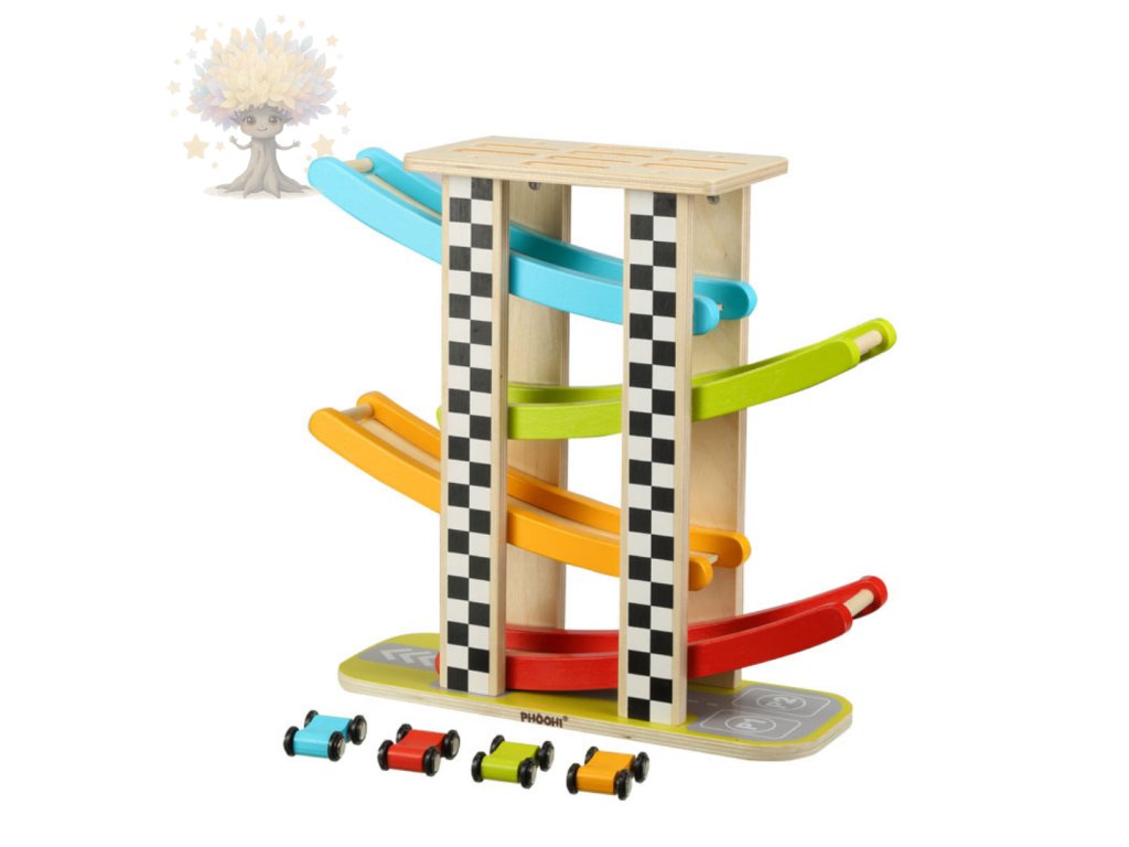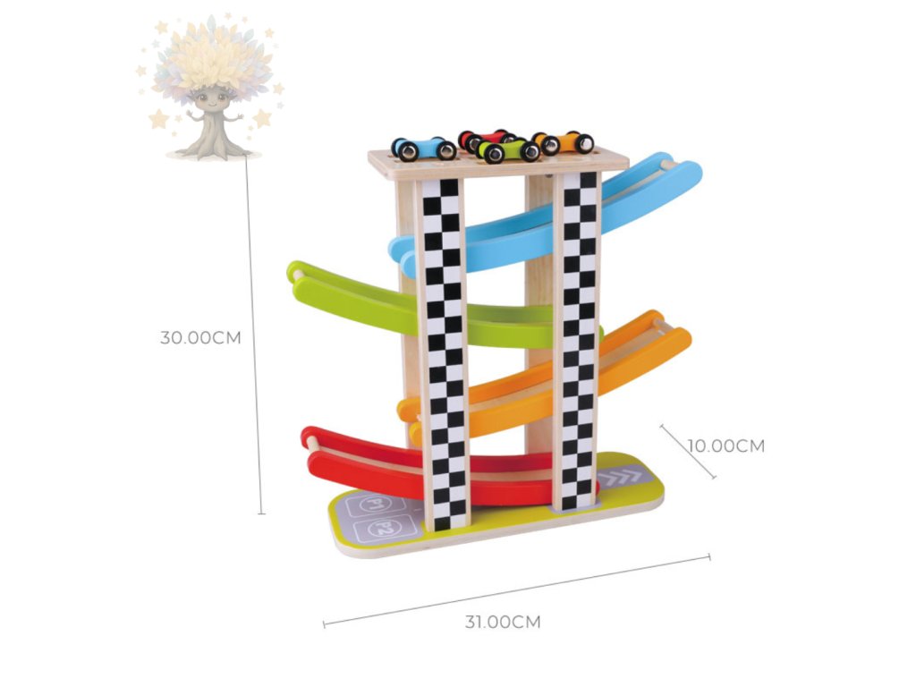 Dřevěná autodráha se 4 barevnými autíčky. Děti pouští autíčka shora a sledují jejich rychlou jízdu po rampách. Skvělá zábava pro malé závodníky.