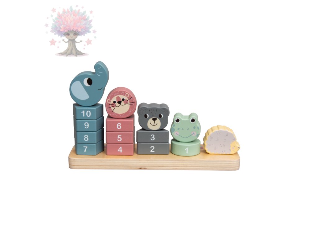 stohovací hra se zvířátky a čísly, která učí děti barvy, čísla a podporuje logické myšlení.