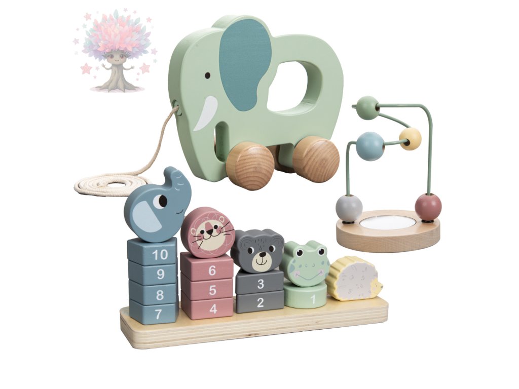 Dřevěná sada hraček pro nejmenší – tahací slon, motorický labyrint a stohovací hra se zvířátky a čísly. Podporuje motoriku, logiku i učení.