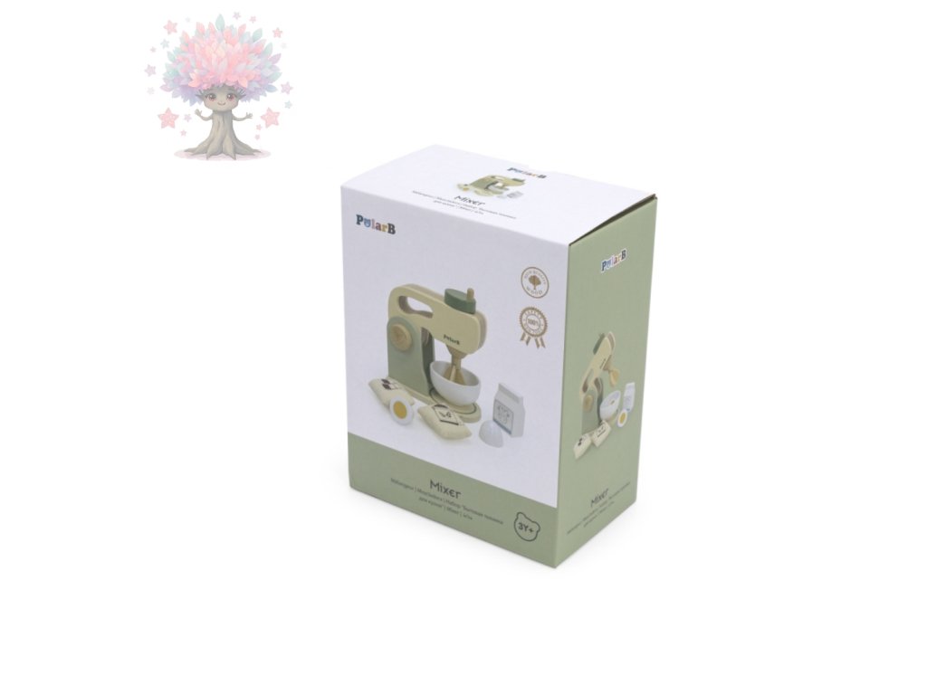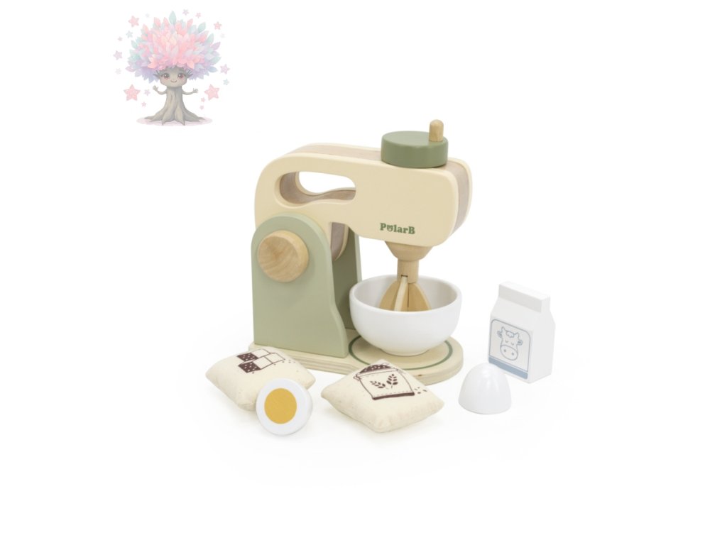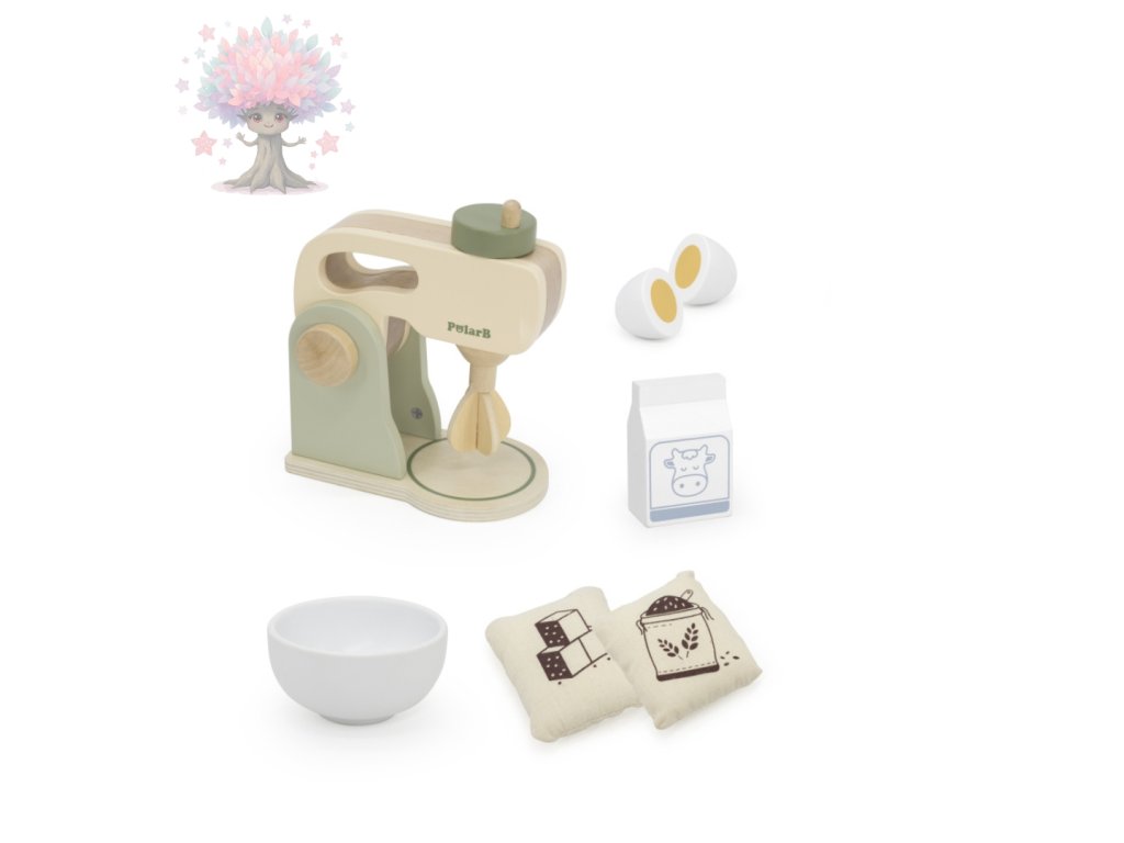 Tento stylový dřevěný mixér potěší všechny malé pekaře a kuchaře. Děti mohou míchat těsto, připravovat lahodné dobroty a přitom napodobovat činnosti dospělých. Součástí balení je mixér s otočnou metlou, miska, vajíčko, krabička mléka a dva látkové sáčky s moukou a cukrem.
