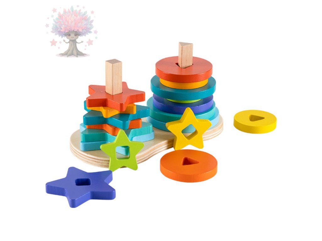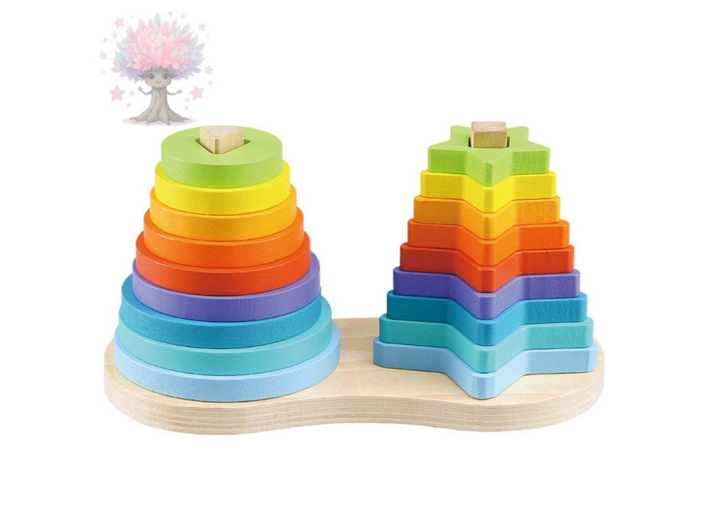 Tato barevná dřevěná skládací pyramida je ideální hračkou pro nejmenší děti. Obsahuje dvě sady tvarů – kulaté kroužky a hvězdičky – které si děti skládají na základnu podle velikosti a barev.
