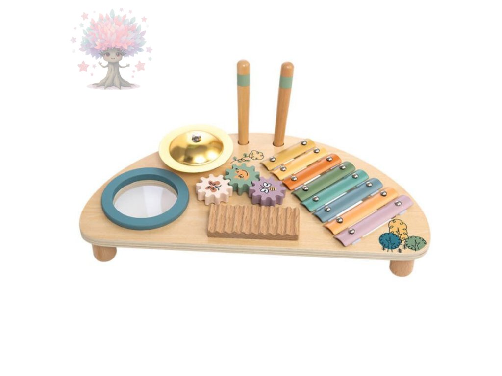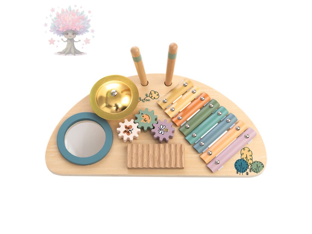 Dřevěná multifunkční hudební hračka pro děti s xylofonem, zvonečkem, bubínkem a ozubenými kolečky. Podporuje rozvoj motoriky, sluchu a kreativity.